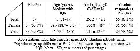 Of the 67 participants, 34 (50.7%) were female and 33 (49.3%) were male. The median age of the participants was 40.0 years (IQR 31-47). Fourteen days after the second dose of the vaccine, 82.1% (55/67) of the participants were seropositive. The mean ± SD serum level of anti-spike IgG was 261.5 ± 48.1 BAU/mL. The antibody level in females was 306.8 ± 49 BAU/mL, while it was 215 ± 42.4 BAU/mL in males. The difference in antibody levels was statistically significant between females and males (P < .05). No statistically significant correlation was found between age and the antibody level of vaccinated individuals (r = 0.097; P > .05). Among seronegative individuals, the median age was 37.5 years (28-45); 25% of these individuals were female, and 75% were male (Table1).