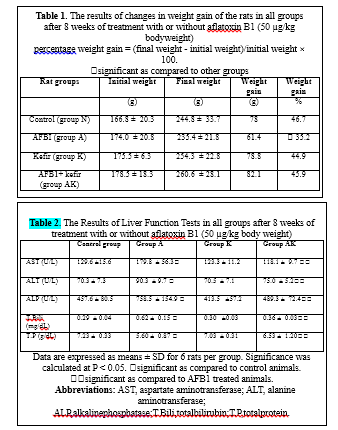 Previous studies have confirmed that AFB1 causes serious damage to the liver, leading to significant changes in liver function tests. Mosaad et al (2020) showed that treatment with AFB1 resulted in a significant decrease in body weight and T.P and increased ALT, AST, creatinine, uric acid, and urea compared to the control group (14).