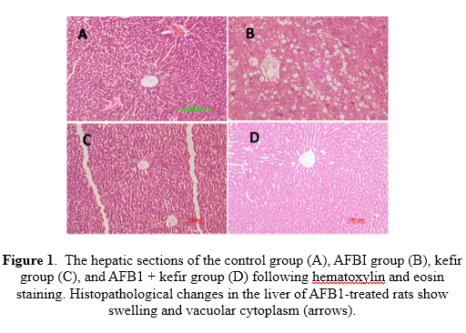 The liver sections of group A showed a disrupted lobular architecture and mild to severe degenerative changes, which were characterized by swelling and a vacuolar appearance of hepatocytes (Figure 1B). Kefir administration decreased liver failure caused by AFB1 intoxication (Figure 1D). The liver of rats fed on a basal diet (Figure 1A) or supplemented with kefir (Figure 1C) showed a normal liver structure characterized by normal hepatocytes arranged as cords.
